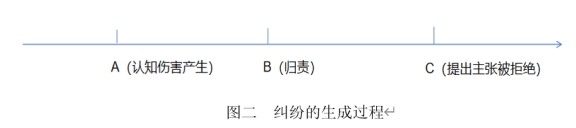另一方面,需要对侵害弱势群体权益情况常发的领域实现法定公证的优先介入。一般而言,纠纷的生成可以分为认知(伤害产生)、归责、提出主张(被拒绝)三个阶段(如图二所示)。