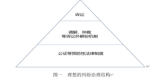 关于纠纷治理结构的探讨,大致有以下几种观点:第一,小岛武司“诉讼中心论”认为,各种纠纷解决机制应当形成以诉讼为中心的同心圆,从内到外依次为中立第三方主持下的机制、第三方协助当事人调整的机制和当事人相对自主的交涉机制。第二,井上治典“平行论”认为,诉讼与诉讼外纠纷解决机制都为当事人的例行对话以及主动性、选择性和自律性地解决纠纷提供场所,它们界限模糊、互相渗透。第三,我国学者提出了依次由公证、调解、仲裁、诉讼四阶段组成的“防线说”。笔者赞同“防线说”,并主张对之进行有针对性的完善。“诉讼中心论”偏离了 “司法作为最后救济方式”的定位,颇有美国的司法指向型ADR的形式外观,与我国的纠纷治理话语体系不相耦合;“平行论” 则显露了建构纠纷治理体系时的“去国家化”倾向,忽视了国家对于纠纷治理资源的动员、整合和配置功能;而“防线说”则较好地考虑了各纠纷解决机制的职能定位,但不足之处在于,未能对各机制在我国纠纷治理结构中的占比进行分配。具体是指,公证需要在前端预防多少纠纷、调解与仲裁等机制需要在诉讼外解决多少纠纷、最终又有多少纠纷可以留待诉讼中解决。笔者认为,我国理想的纠纷治理体系应当形成一个从下到上分别为公证等预防性法律制度、调解与仲裁等诉讼外纠纷解决机制、诉讼的金字塔型结构 (如图一所示)。