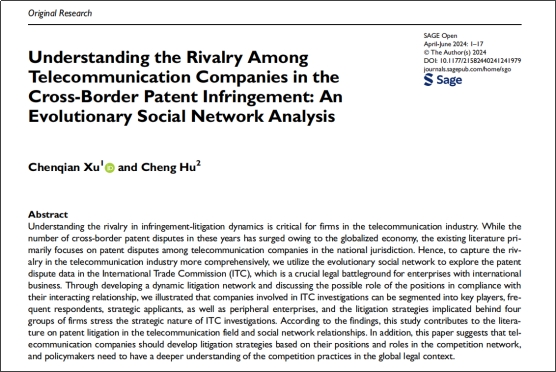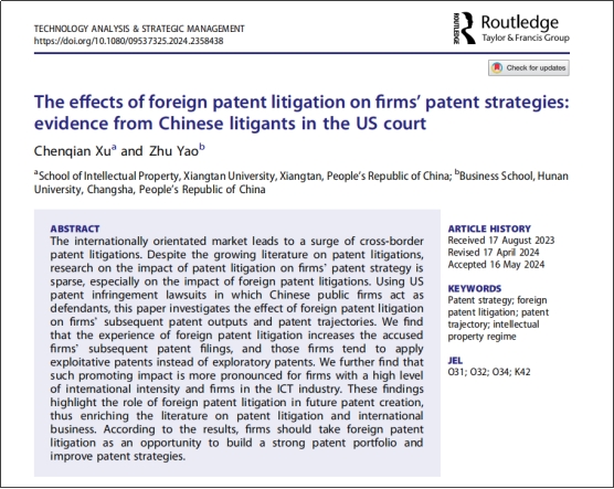 近期,我部知识产权学院青年教师徐晨倩博士在Journal of Knowledge Management(Q1)、Management Decision(Q1)、Knowledge Management Research & Practice(Q1)Technology Analysis & Strategic Management(Q2)等SSCI来源期刊发表多篇高水平学术论文,研究主题涵盖知识产权管理与知识管理等领域,以理论探索与跨学科方法融合为核心,深入探讨了中国企业的海外知识产权纠纷等研究问题,标志着我部在国际化学术研究方面取得显著进展。其中,论文“The effects of foreign patent litigation on firms’ patent strategies: evidence from Chinese litigants in the US court”曾受学部资助前往美国芝加哥参与国际学术会议并进行宣讲,为后期的发表提供了重要支持。