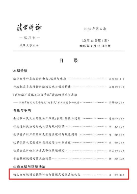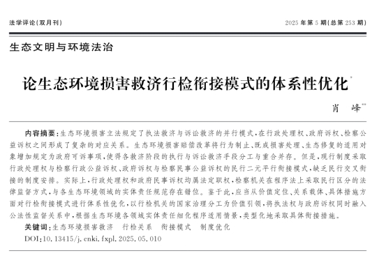 近日,我院学部肖峰教授在CSSCI来源期刊《法学评论》2025年第5期发表《论生态环境损害救济行检衔接模式的体系性优化》一文。