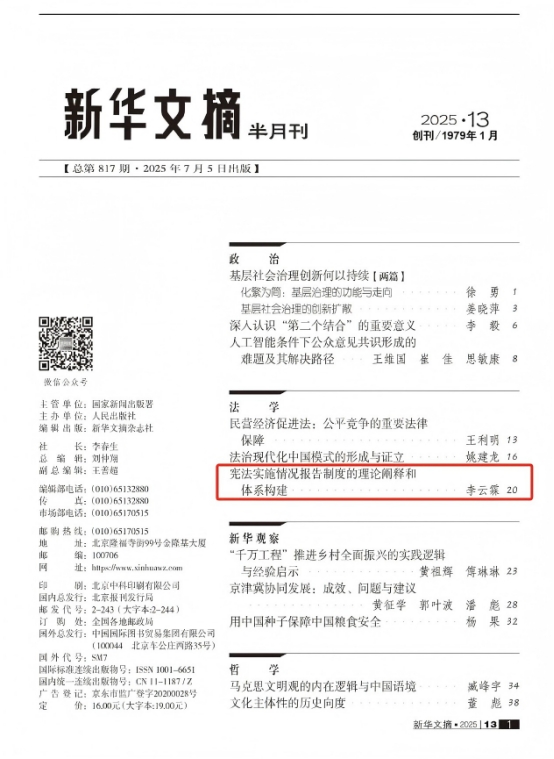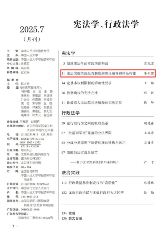 近日,我部李云霖教授的研究成果《宪法实施情况报告制度的理论阐释和体系构建》又被人大复印报刊资料《宪法学、行政法学》2025年7月转载。此前,该文被《新华文摘》2025年第13期转载。《宪法实施情况报告制度的理论阐释和体系构建》原载于法学权威期刊《中国法学》2025年第2期,文章是其主持的2024年度国家社科基金一般项目“全国人大及其常委会法律草案合宪性审查的体系构造研究”(项目批准号:24BFX008)的阶段性成果。