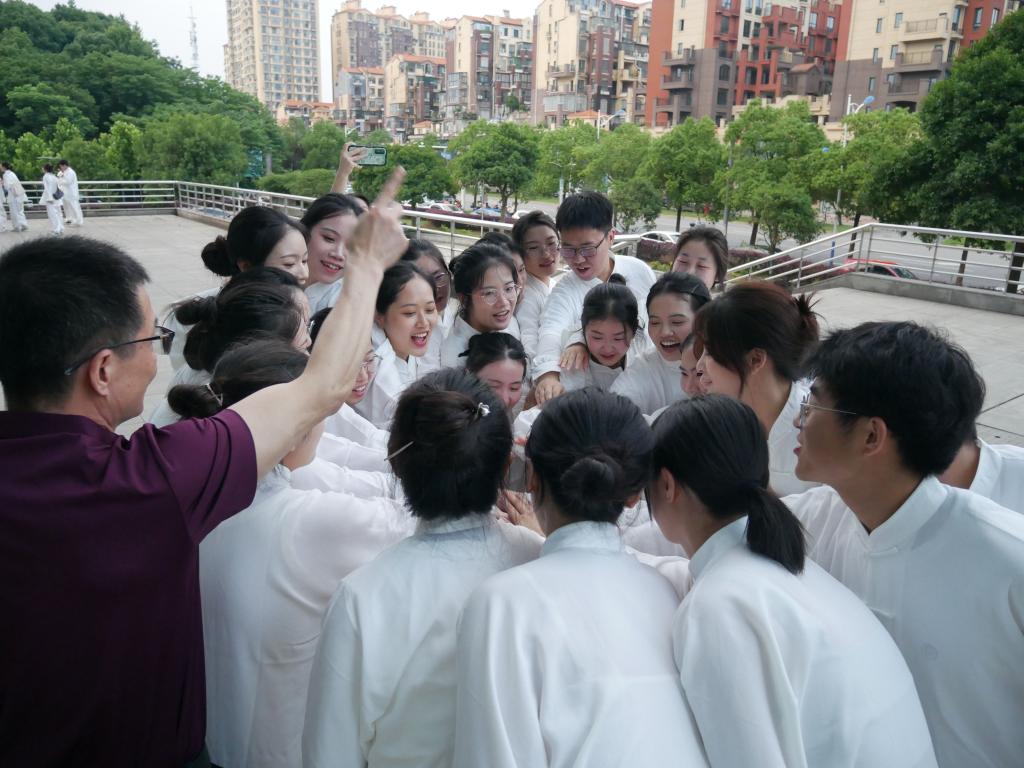 比赛当天,同学们穿上八段锦练功服、练功鞋,早早来到体育馆东门进行最后一次赛前练习,服饰统一后,我院学部八段锦练习更显整齐规范。练习结束,王雄老师组织大家围聚叠掌,一起呐喊加油,鼓舞士气!