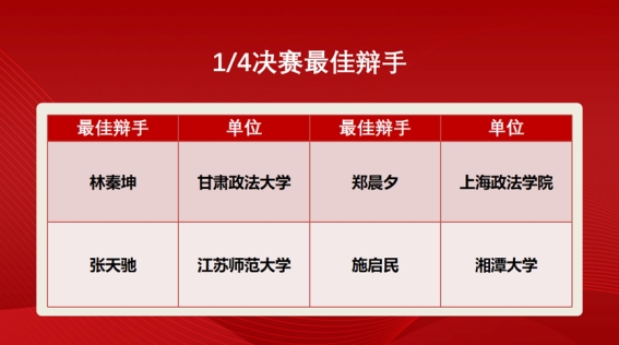 我院学部遗憾止步全国八强,与上年度成绩(八强,二等奖)持平。本次比赛中,湘潭大学代表队施启民获得1/4决赛最佳辩手。