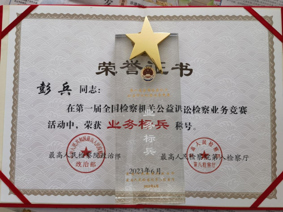 我院2006级法学本科、2010级刑法学硕士院友(导师为赖早兴教授),现任职于长沙市人民检察院第七检察部(公益诉讼检察部)的彭兵同志,以总分第四名的优异成绩,荣获“全国公益诉讼检察业务标兵”称号。