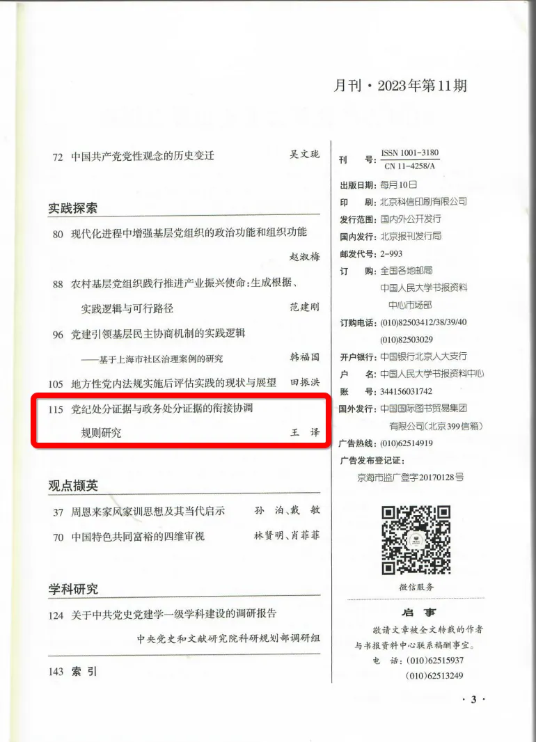 我院王译博士的论文《党纪处分证据与政务处分证据的衔接协调规则研究》(原载《党内法规研究》2023年第3期),被人大复印资料《中国共产党》2023年第11期全文转载。