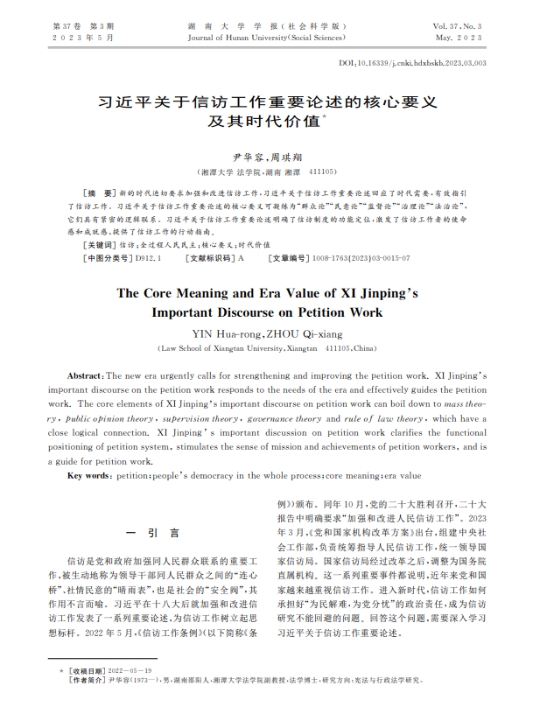 我院尹华容副教授的论文《习近平关于信访工作重要论述的核心要义及其时代价值》刊发于