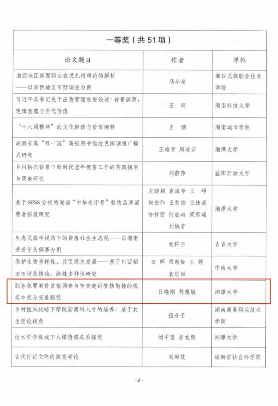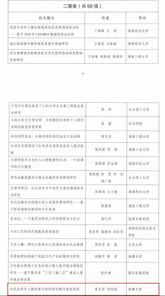 第十二届湖南省社会科学界学术年会优秀论文名单于10月31日公示,我院吕晓刚老师和夏先华老师分获优秀论文一、二等奖。本届学术年会共收到论文640篇,经专家评审,共评出优秀论文129篇,其中特等奖10项、一等奖51项、二等奖68项。