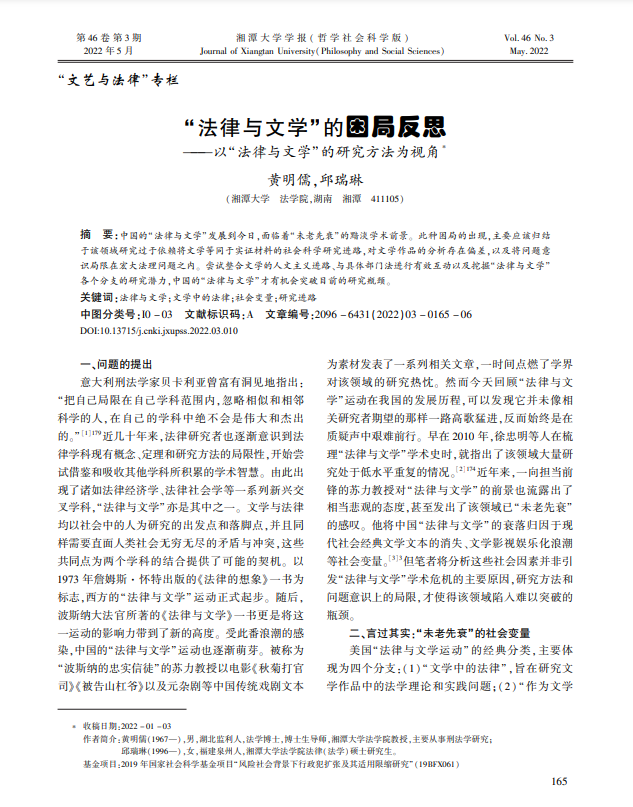“法律与文学”的困局反思——以“法律与文学”的研究方法为视角》刊发于