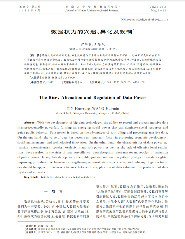 我院尹华容副教授和王惠民合著论文《数据权力的兴起、异化及规制》刊发于