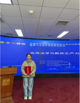 2024年12月15日,天津市法学会应用法学分会2024年学术年会暨第十五届天津应用法论坛在天津工业大学举行。会议以“应用法学与新质生产力”为主题,通过三个平行论坛,分别围绕“法律实施与司法改革”“数字法学与营商环境”“知识产权与数智赋能”三个议题展开交流研讨。我院学部2023级硕士生吴晓琳应邀参加了此次会议。