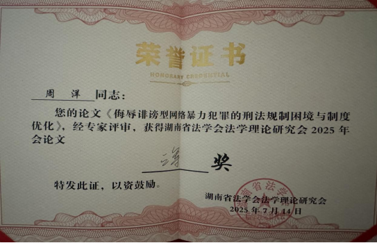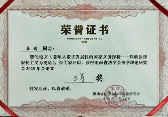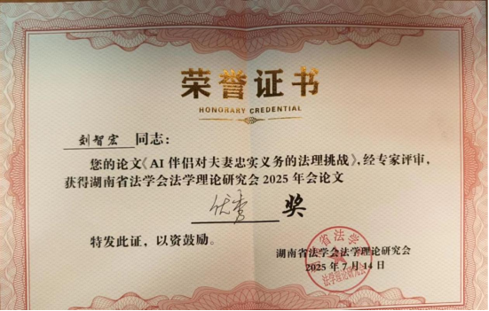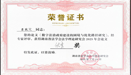 我院学部2023级硕士研究生吕孜芃,2024级硕士研究生唐晴、周洋和刘智宏应邀参会。吕孜芃、唐晴、周洋和刘智宏分别撰写的《数字法治政府建设的困境与优化路径研究》《老年人数字发展权的国家义务探析—以软法律家长主义为视角》《侮辱诽谤型网络暴力犯罪的刑法规制困境与制度优化》《AI伴侣对夫妻忠实义务的法理挑战》,经组委会多轮匿名评审,成功入选会议论文集,唐晴和周洋的论文获三等奖,刘智宏和吕孜芃的论文获优秀奖。