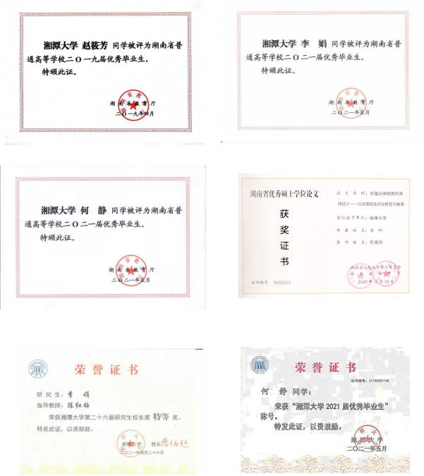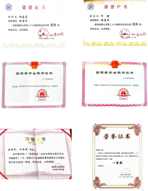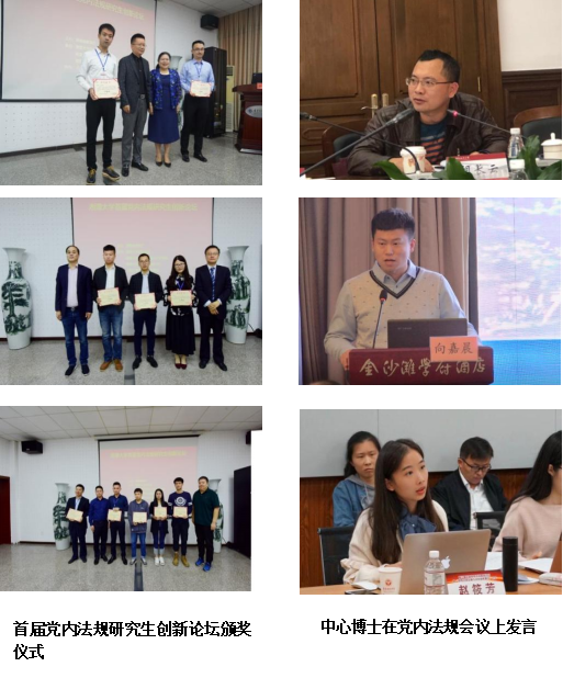 (六)在学生的培养教育方面,中心重点培养优秀党内法规青年学子,现已有多名学子取得省优秀毕业生、省优秀毕业论文、湘潭大学研究生校长奖、学术论坛一等奖等荣誉。