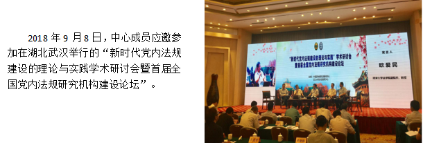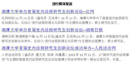 2019年10月12日,中心举办“首届党内法规研究生创新论坛”,吸引中国人民大学、华东政法大学、武汉大学、西南政法大学、南通大学、湖南大学、湘潭大学、湖南科技大学、邵阳学院等高校、研究机构五十余名权威专家和青年学子赴中心交流。会议的成功举办受到了社会各界较为广泛的关注,集中展现了青年学子们对新时代党内法规制度建设的最新见解,为加强党内法规制度体系建设提供了有益的理论支撑。