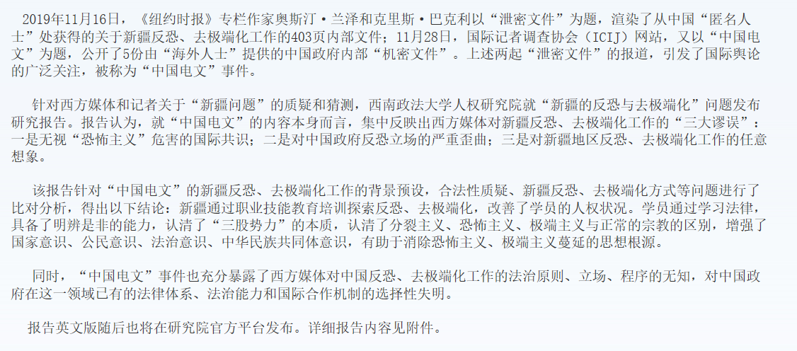 西南政法大学人权研究院就西媒“中国电文”事件发表研究报告