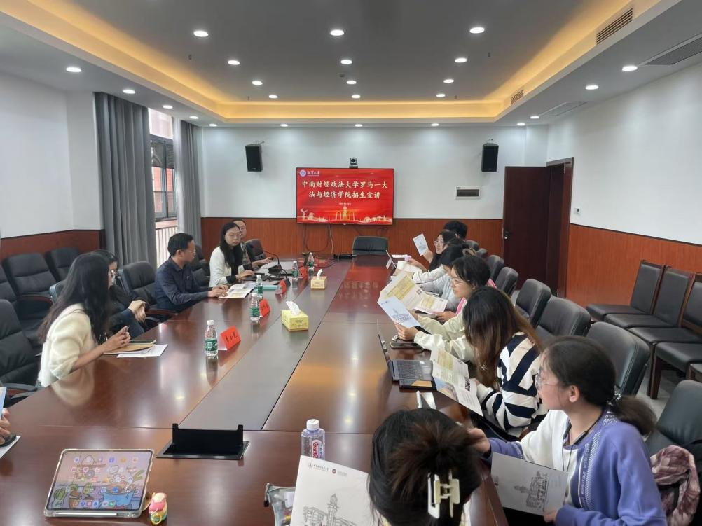 为拓展法科学子升学渠道,4月8日下午,中南财经政法大学罗马一大法与经济学院2025年硕士研究生招生宣讲于我院学部永雄楼711会议室顺利举行。此次宣讲由中南财经政法大学闫彬彬、田守顺老师主讲,我院学部党委副书记黎益君、学工办辅导员江冰洁和李小艳老师出席会议。