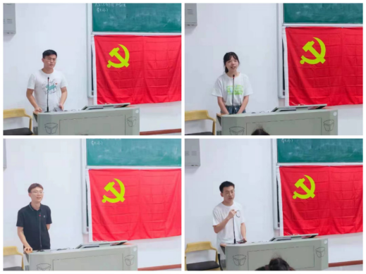 吴金龙、王文倩、袁兆瑞、张召四位支部党员来自同一个寝室,大学期间4个“革命战友”相互帮助,携手共进,先后入党。毕业后他们一人继续深造,三人成为上市国企法务,各自走上了新的征程。吴金龙同志分享了舍友与老师们对其学习、生活等各方面的鼓励,并向老师和同学们表达了真挚的感谢。袁兆瑞同志对支部的学弟学妹们说:“一定要坚持热爱,坚持理想,坚持目标,即便失败也不要放弃,努力就有希望。”
