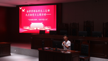 2021年9月26日下午,yl23455永利官网本科生第二党支部在法学楼模拟法庭开展了九月份主题党日活动。本次主题党日的主题为弘扬奥运精神,传承华夏文化,本次活动由郭泳杉同志主持,二支部全体党员参加。