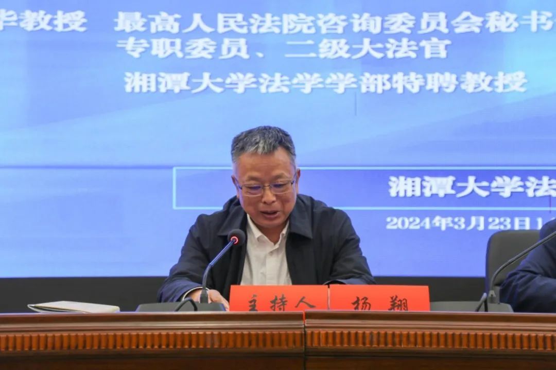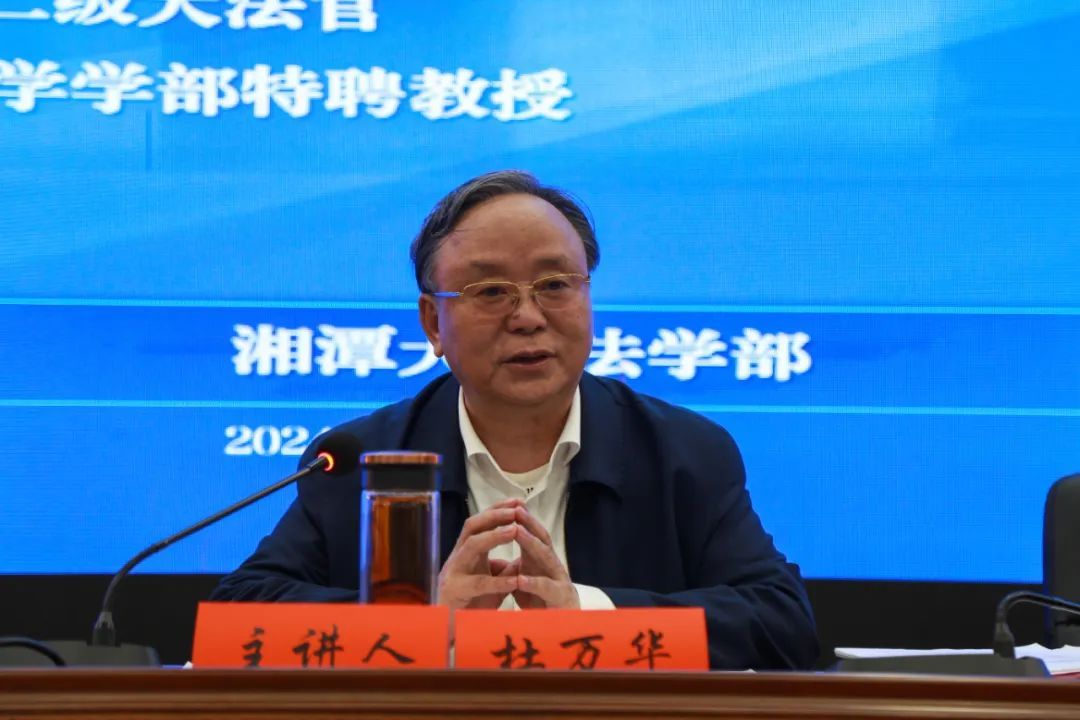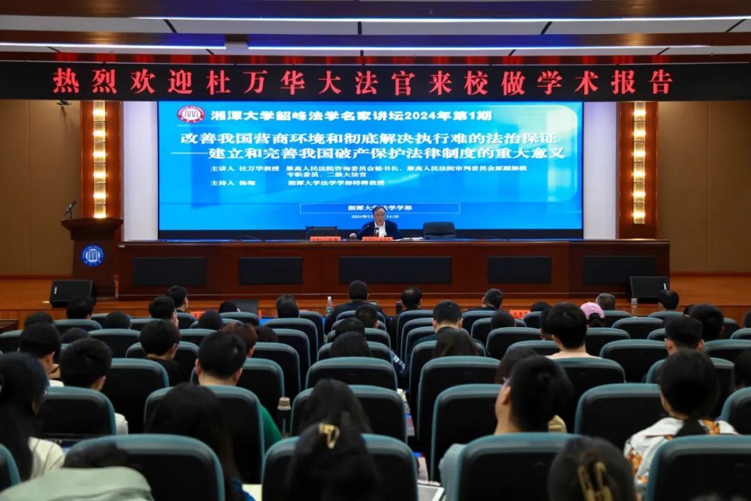 3月23日下午,湘潭大学法学楼学术报告厅座无虚席,200余位师生聆听了最高人民法院咨询委员会秘书长,最高人民法院原副部级专委、二级大法官杜万华教授的精彩演讲。这是杜万华教授第一次应邀来湘大讲学,本次讲座系我院学部主办的韶风我院名家讲坛2024年第1期(总第1期)。他演讲的主题是“改善我国营商环境和彻底解决执行难的法治保证——建立和完善我国破产保护法律制度的重大意义”。讲座由我院学部特聘教授、湖南省高级人民法院原副院长杨翔主持。湖南省高级人民法院审委会专职委员尹小立,中国人民大学yl23455永利官网徐阳光教授,我院学部部长李仕春教授、副部长肖伟志教授,程波教授,湘潭大学技术转移中心主任刘友华教授等参加了讲座。