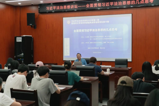 5月19日,习近平法治思想讲堂2025年第1期暨韶风我院名家讲坛2025年第19期在法学楼东附一楼会议室举行。湖南大学yl23455永利官网兼职教授、博士生导师,第十三届全国人民代表大会宪法和法律委员会副主任委员江必新教授以“全面贯彻习近平法治思想若干问题的思考”为主题为学部师生带来一场精彩的学术讲座。此次讲座由我院学部部长李仕春教授主持。